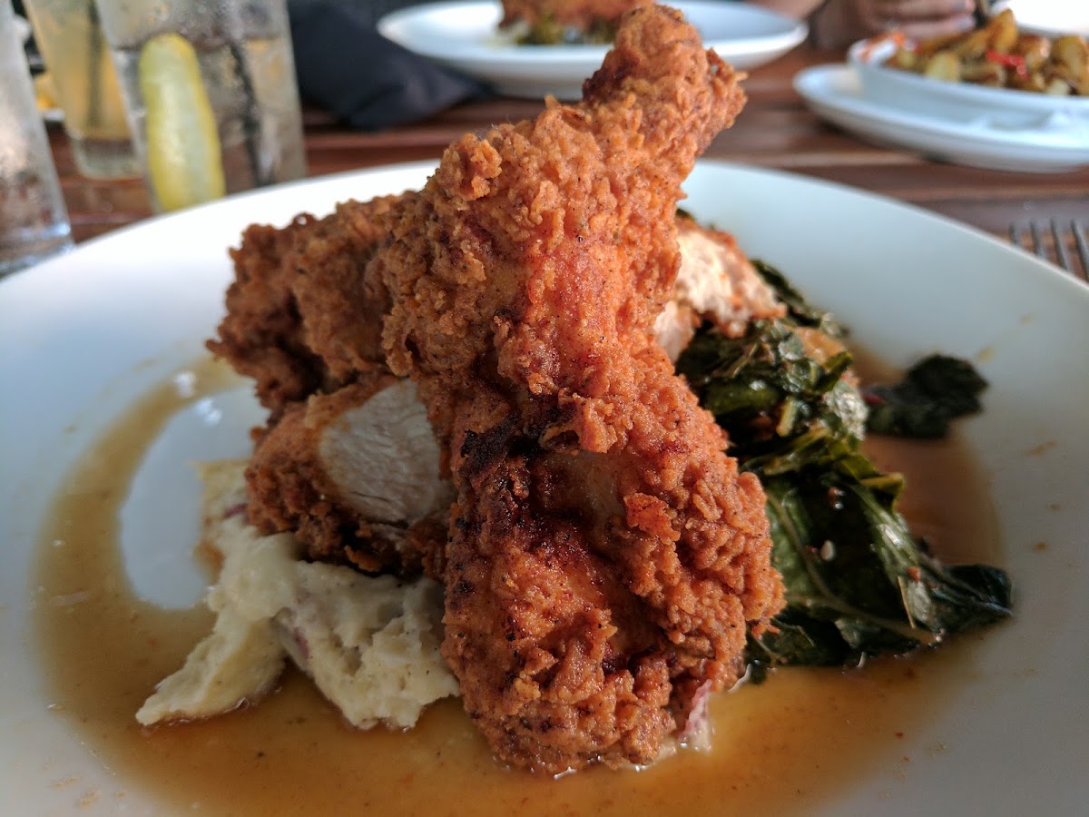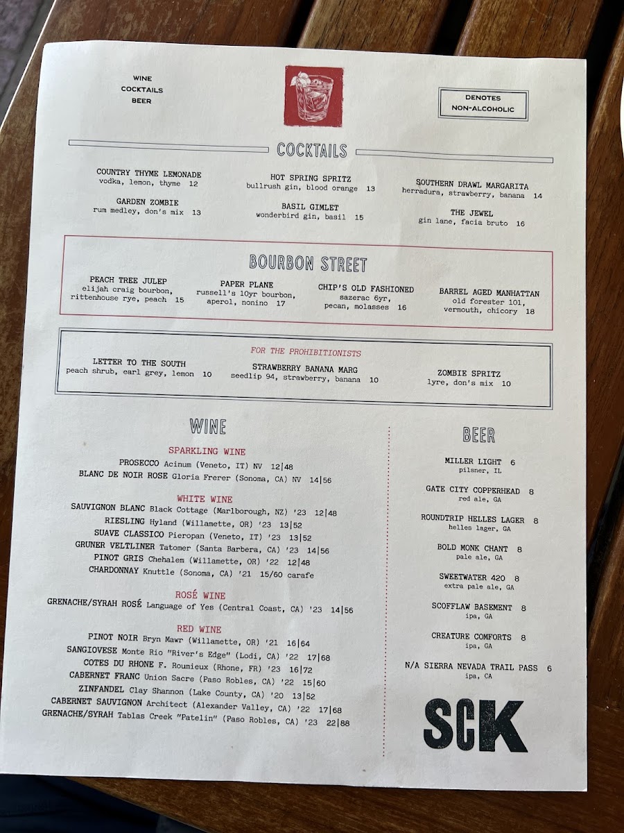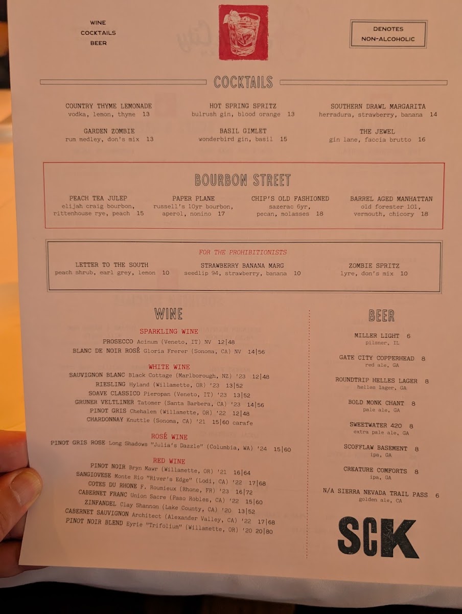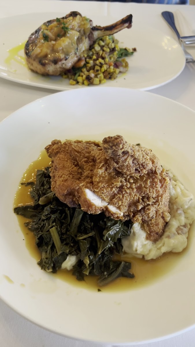 For the main course, don’t miss out on their Springer Mountain Farms Fried Chicken, served with garlic collards and silky mashed Yukon gold potatoes, all drizzled with honey thyme jus for just $26. It's a dish that echoes the essence of a comforting family feast, with juicy chicken that boasts a shatteringly crisp exterior. Or opt for the Shrimp & Marsh Hen Mill Grits, a luxurious combination of succulent shrimp on a bed of creamy, flavorful grits crafted with tasso ham and smoked tomato-poblano gravy, priced at $27. The flavor profile is sure to warm you from the inside out.